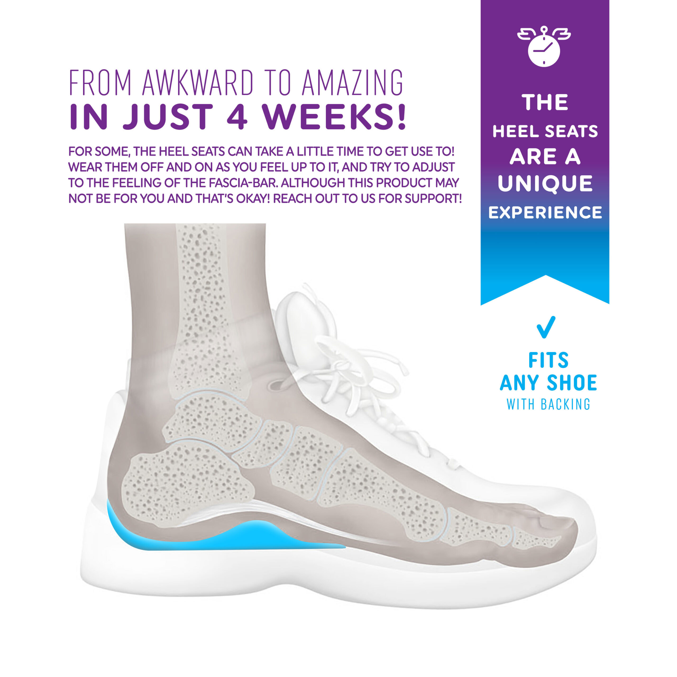 Listen to your feet, even when the pain “isn’t too bad” or happens only intermittently. Heel Seats help your feet with acupressure. The Fascia-Bar insert works to stretch and strengthen the plantar fascia ligament into a healthier position.